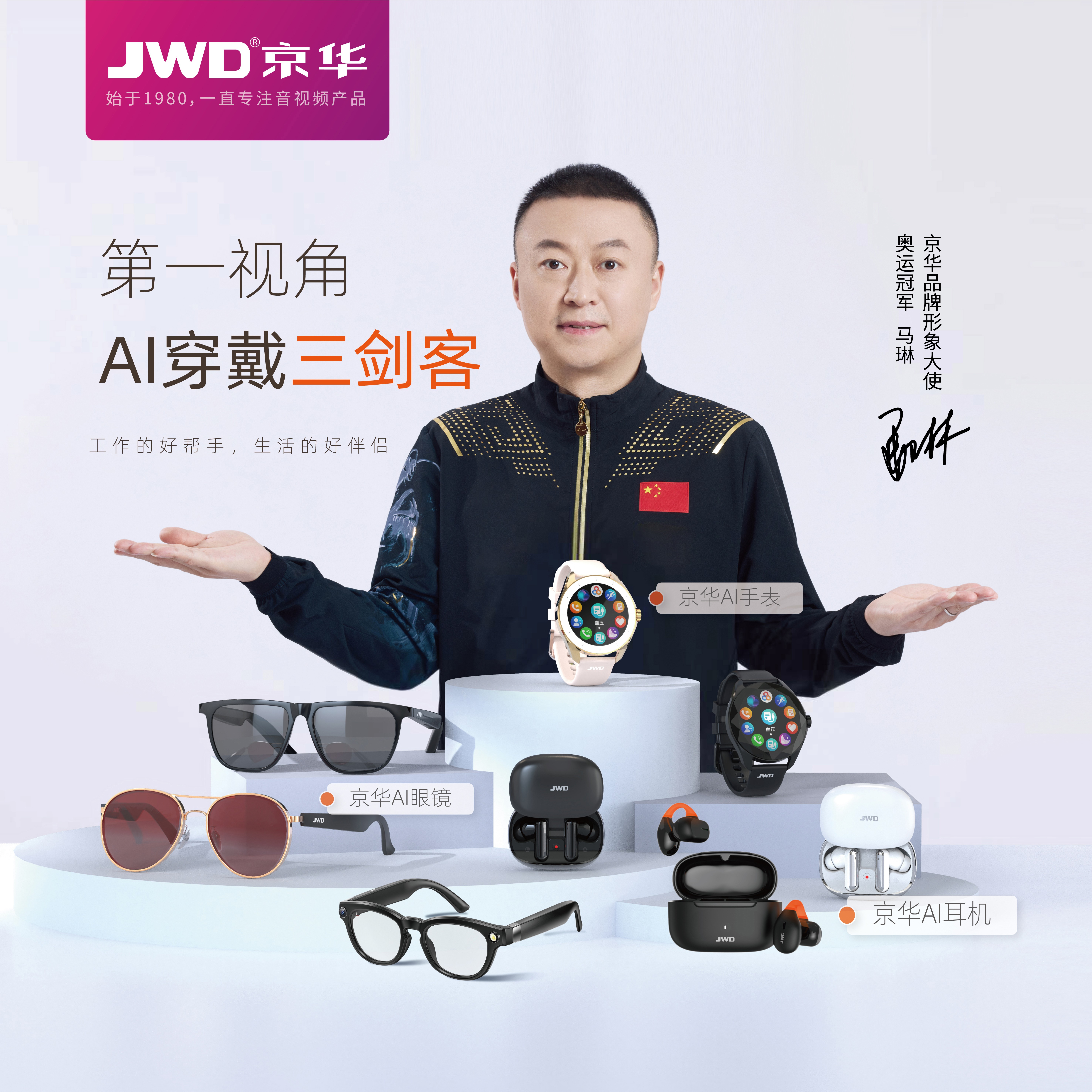 1月20日,京华公司与乒乓球奥运冠军马琳举行签约仪式,正式邀请马琳先生担任JWD京华品牌形象大使。活动现场,马琳向与会嘉宾及媒体展示了京华最新推出的AI眼镜、AI手表、AI耳机等智能穿戴产品,并对京华现有的智能装备系列产品频频点赞。此次“冠军代言+AI新品”,代表着京华公司在音视频领域的传承与创新,一直与时代同频。